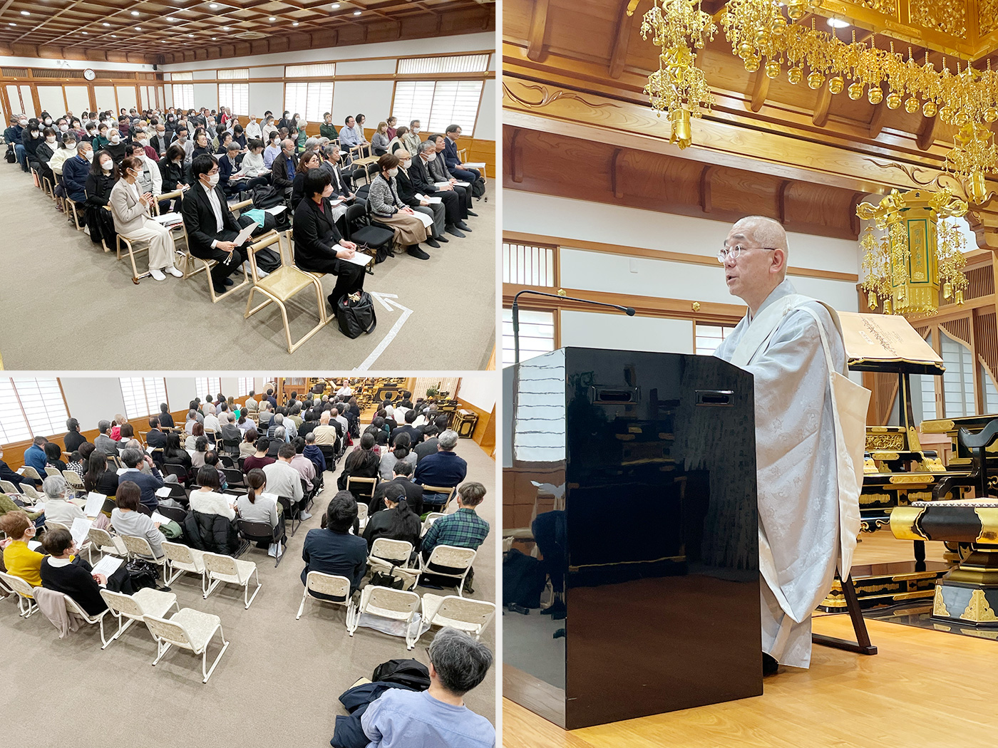 読経・広布唱題行終了後、天野御住職より、「自分勝手な思いなどの私心をかなぐり捨てて、自身のお命を御本尊様におまかせしてお題目を唱えていく中に、自ずと知らぬうちに大きな福徳を積むことができる。」等と述べられたのち、『土籠御書』および総本山第二十六世日寛上人『如説修行抄筆記』を引用され、「身口意(しん・く・い)の三業にわたる信心が大切である。心と口と身で御本尊様を拝して信心していかなければ本当の幸せはないし、私たちの願いは叶わない。自行と折伏行の両輪が大事であり、自分の幸せだけ願っていたのでは、身口意のいずれかが傷んでくる。」等との御指導をいただきました。