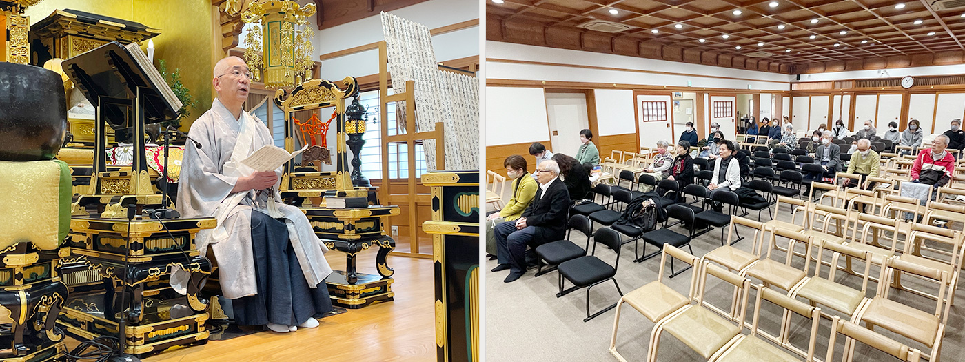 法要は読経・唱題行、各家塔婆供養・永代供養精霊等の追善回向と如法に厳修され、そののち御法話に先立ち、天野御住職より『上野殿御返事』を拝読申し上げ、通解並びに同抄全体の概要等について述べられたのち、「上行菩薩を上首とする地涌の菩薩衆は、久遠以来の〈本化〉の菩薩である。滅後末法の法華経の弘通を託された地涌の上首・上行菩薩様は日蓮大聖人様であり、その御内証・本地は久遠元初の御本仏である。『諸法実相抄』に〈皆地涌の菩薩の出現に非ずんば唱へがたき題目なり〉と仰せのように、今の私たちは大聖人様の弟子檀那として、大聖人様と同じ題目を唱えている〈地涌の菩薩の流類〉である。私たちはその自覚の上に立ち、何があってもどこまでも退転なく生涯にわたって折伏に精進し、多くの人たちに伝えていく使命がある。」等との御指導をいただきました。