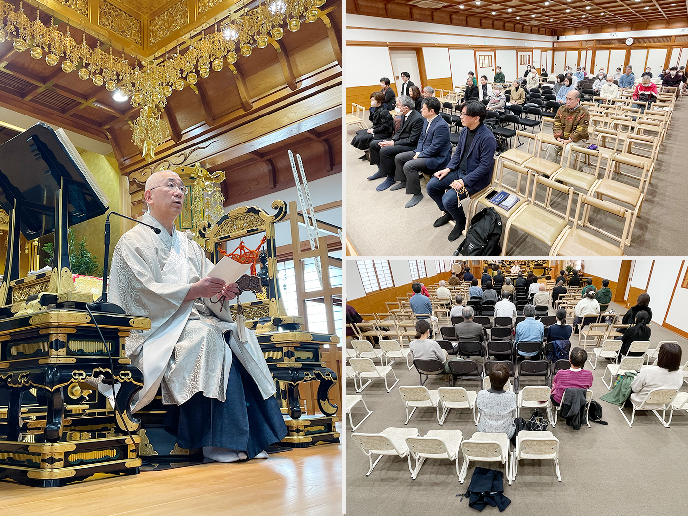 法要は献膳・読経・唱題と如法に厳修され、七五三祝いののち、天野御住職より令和7年11月度・御報恩御講拝読御書『兄弟抄』を拝読申し上げ、通解並びに池上家と当時の時代背景、同抄全体の概要等について述べられ、「私たちの生活においても、ご夫婦のどちらかが信心していない、両親は信心していても子供は信心していないなど、同じ御本尊様を拝せないところから苦しみが生じる。ことに子供に信心を法灯相続できていないと、自身が老齢になった時に厳しい状況にもなり得る。自分の人生の最後まで御本尊様を拝していけるようによくよく考え、しっかりと法灯相続しなければならない。池上兄弟は20年もの歳月をかけて真言律宗の僧・極楽寺良寛の熱心な信者であった父親を折伏した。皆さんにおいてもこれから大変な場面があったとしても、どこまでも御本尊様を中心に、決して魔に負けることなく、自分の人生を誤らないように、何があっても真っ直ぐに進んでまいりましょう。」等との御指導をいただきました。
