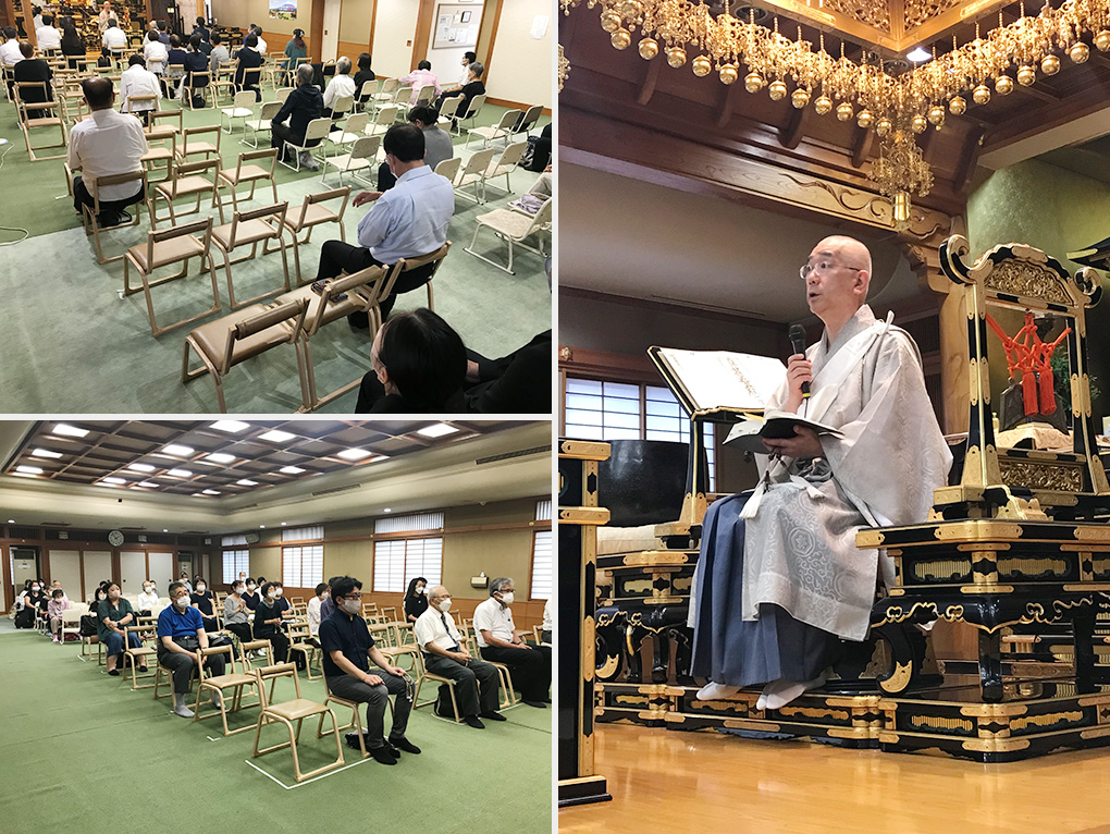 法要は読経・焼香・唱題、各家塔婆供養・永代供養精霊等の追善回向・願い出の諸御祈念等と如法に厳修され、そののち天野御住職より、御法話のはじめに『刑部左衛門尉女房御返事』の御文を拝読申し上げました。そして「お盆の起源」として、釈尊十大弟子の一人・神通第一の目連尊者が、餓鬼界に堕ちた母親を神通力をもって救おうと尽力したものの叶わず、釈尊に教えを乞うて母を餓鬼界から一劫の間救うことができた。しかしそれは母を成仏に導いて救うには至らず、さらに釈尊の教えに従って、法華経をもって目連尊者自身が修行し仏の境界となって供養することで、母を永遠に餓鬼界から救い成仏に導くことができたという説話を紹介され、「一つの大きな節目である本日の盂蘭盆会にあたり寺院に参詣され、日蓮大聖人の御本尊様のもと塔婆を建立されお題目を唱え、仏様の境界をもって亡き諸精霊を供養されたことで、亡き諸精霊もこれ以上ない功徳をいただいているものと確信いたします」と御法話を結ばれました。