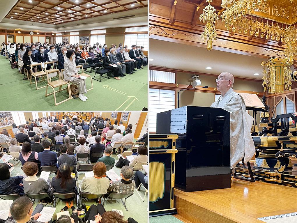法要は献膳・読経・唱題と如法に厳修され、そののち御法話にあたり令和5年5月度・御報恩御講拝読御書『諸法実相抄』を拝読申し上げ、通解並びに同抄の背景と縁由、対告衆である元天台宗僧侶・最蓮房日浄のこと、また「久遠即末法」「種脱相対」の上から日蓮大聖人が久遠の御本仏である証左について述べられ、そののち「〈日蓮が一門となりとをし給ふべし〉との御文から、生涯、何があっても決してこの御本尊様から離れてはならないのだと拝していかなければならない」等と御指導され、また本未有善(ほんみうぜん)の私たちが地涌の菩薩であるということについて日顕上人の御指南を引用され、「御本尊様を受持信行する人は、自覚はなくとも皆さんの生命が地涌の菩薩の生命に変わり、またその地涌の菩薩としての功徳も存する。これからも〈日蓮が一門となりとをし給ふべし〉と心に刻んで、自行化他の信心にご精進ください」等との御指導をいただきました。