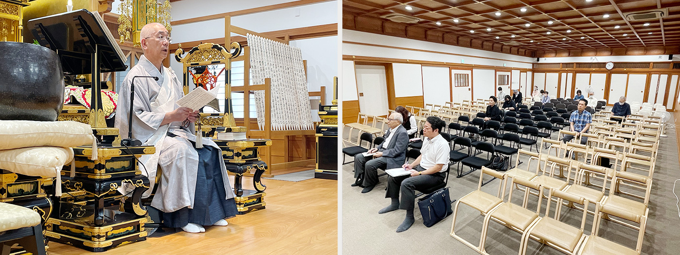 法要は読経・唱題、各家塔婆供養・永代供養精霊等の追善回向と如法に厳修され、そののち御法話に先立ち、天野御住職より『乙御前御消息』を拝読申し上げ、通解並びに当時の背景、全体の概要等について述べられたのち、「何よりも志を積み重ねていくならば、他の人よりも功徳・利益も勝る。私たちの信心において〈志を積み重ねる〉とは、日々に自行化他に精進するということである。そこに前向きに取り組む人が志を重ねる人である。御法主上人猊下の御指南のままに、そして共々に励まし合いながら頑張ってまいりましょう。」等との御指導をいただきました。