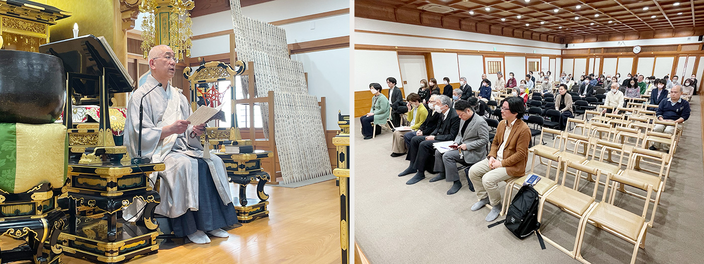 読経・広布唱題行終了後、天野御住職より、御法話に先立ち『千日尼御前御返事』の御文を拝読申し上げ、通解並びに阿仏房と千日尼について述べられたのち、「佐渡から身延まで片道21日の道のりを、87歳から90歳まで高齢の身で命懸けで、三度も大聖人様のもとへ参詣された阿仏房の御信心を手本としなければならない。今は車も電車もある恵まれた時代であるし、健康に留意して長生きをし、一回でも多く篤い御信心をもって御登山していただきたい。本年は特に、支部総登山はもちろんのこと、5月からの講習会登山にも積極的に参加していただきたい。総本山に集って自宗の教義を勉強するなどという宗派は他には一切なく、大変恵まれていることである。」等との御指導をいただきました。