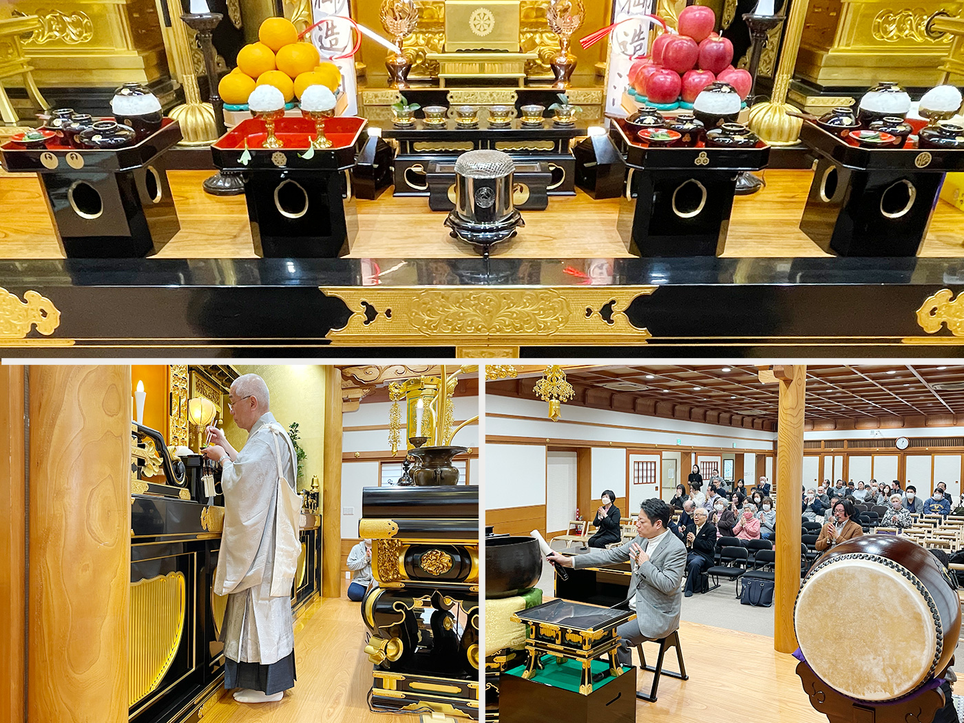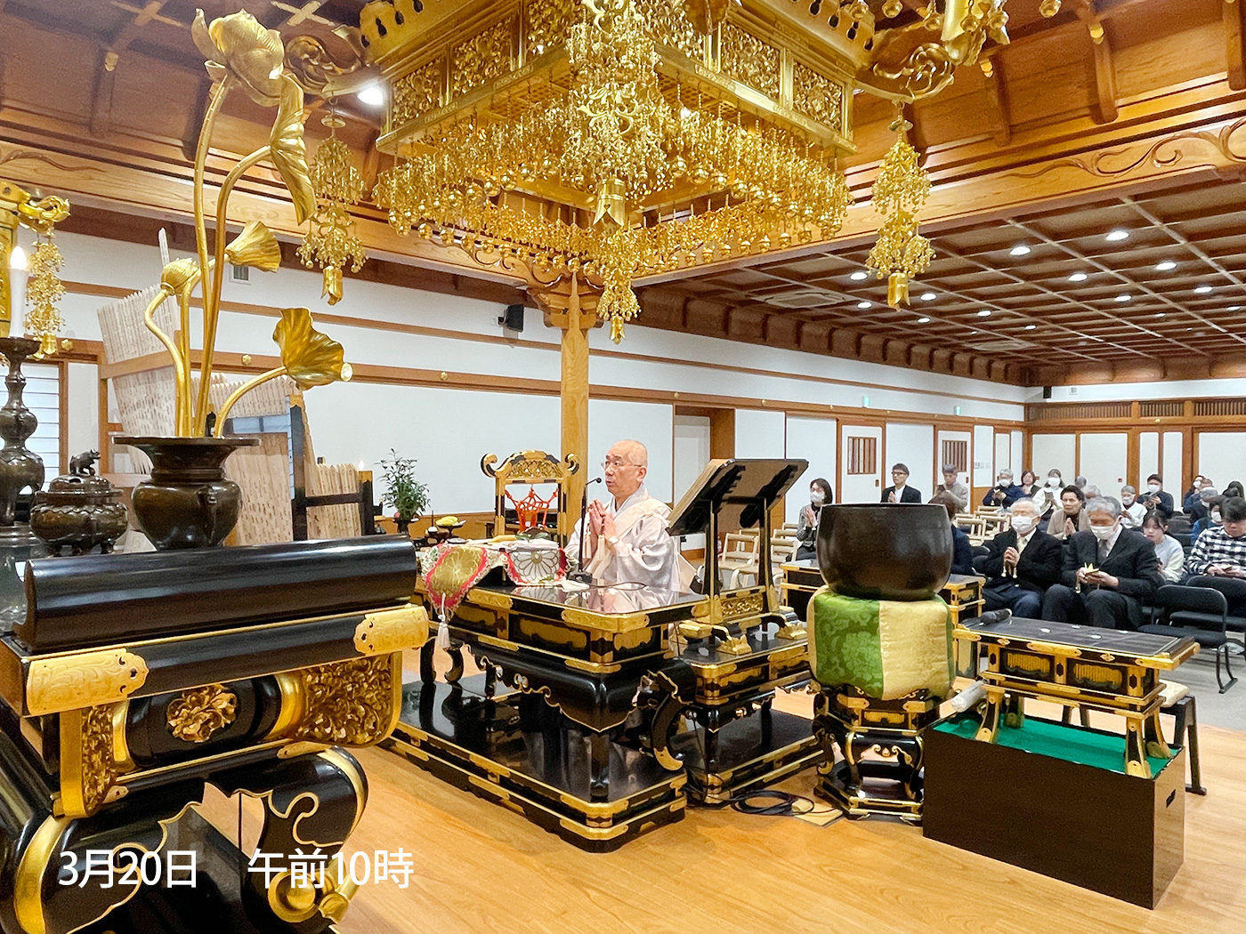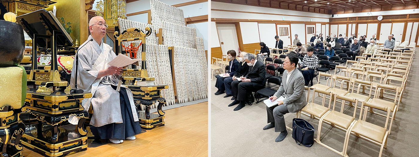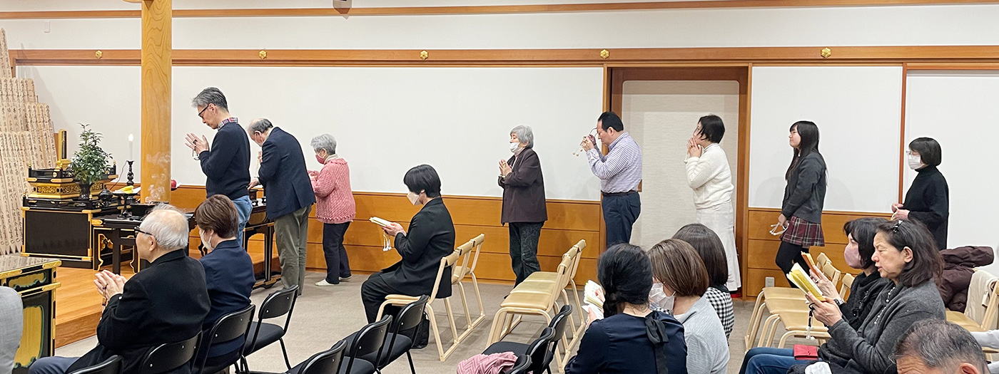 法要は献膳・読経・唱題(午前10時の回は百日間唱題行)と如法に厳修され、そののち天野御住職より『中興入道御消息』の御文を拝読申し上げ、彼岸会の意味として、「〈彼岸〉とは古代インドの〈パーラム・イータ〉という語から来ており、意味としては〈到彼岸(彼岸に渡る)〉、すなわち亡き諸精霊方を迷いの世界である〈此岸(しがん)〉から悟りの〈彼岸〉に渡らせることです。此岸と彼岸の間には大きな川が流れているとされ、その川を大勢で安全に渡るためには、小乗教の小舟ではなく大乗教の大船、大乗教の中には法華経、法華経の中には日蓮大聖人の南無妙法蓮華経の大船でなければ悟りの彼岸には到達できません。すなわち御本尊様にお題目を唱えることこそが成仏の境界に至る唯一の道なのです。」等と述べられ、さらに「仏教を修する者は、必ず四恩に報いなければなりません。その中でもまず初めに〈父母の恩〉を知り(知恩)報いる(報恩)ことが大切です。諸精霊方は自身でお題目を唱えることができないので、私たちが御塔婆を建立して読経・唱題して積んだ功徳善根を、お焼香と御祈念によってご先祖の皆さんに回し向かわしめるのです。冒頭拝読の『中興入道御消息』の御文の趣意は、お題目を認(したた)めたお塔婆の計り知れない功徳を述べられており、私たちも日々の勤行・唱題に励み、〈常盆〉〈常彼岸〉を心掛け、亡き諸精霊の節目にあってはお塔婆を建立して親孝行に努めることが大切です。」等との御指導をいただきました。。